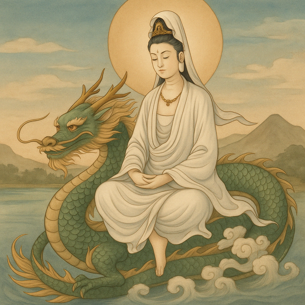 Una delle rappresentazioni più affascinanti la mostra mentre cavalca un drago. Il drago, creatura sacra nella cultura orientale, non è un nemico da combattere, ma un custode degli opposti, che danza tra cielo e terra, tra Yin e Yang.
